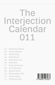 The Interjection Calendar is an on and offline project, devised and hosted by Montez Press. Each month an artist or writer is commissioned to produce a new piece of work for release on our website. The PDF can be downloaded for free and there are 12 releases per year. At the end of the year the collection is published, demonstrating a diverse range of collaborations and experimental works, mapping the year in contemporary art writing, with equal space held for the emerging and the established. The Calendar reflects the current importance of online content media, pushing the relationship between image and text in this domain.